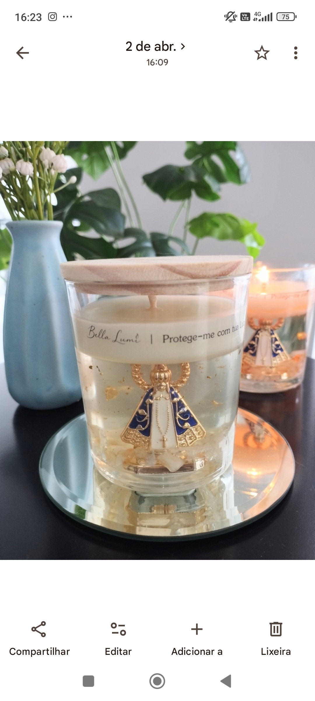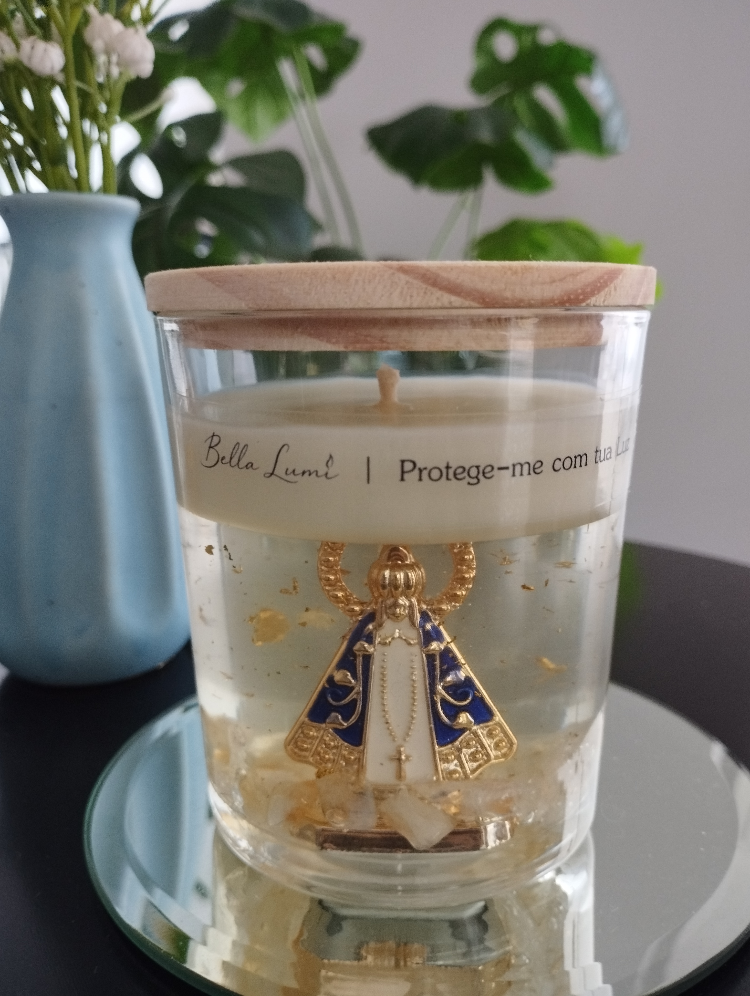 Vela Nossa Senhora Aparecida – Coleção Fé Uma vela que transcende o aroma e se transforma em um símbolo de fé, proteção e conexão espiritual. Com fragrância suave de algodão, traz uma sensação de pureza, acolhimento e serenidade, envolvendo o ambiente com leveza e paz. Mais do que perfumar, sua presença cria um espaço de oração, silêncio e intenção — um convite para momentos de introspecção e espiritualidade. Notas olfativas: Saída: notas frescas, algodão limpo Corpo: flores brancas suaves Fundo: musk branco, toque aconchegante Pensamos em cada detalhe: a vela é composta por base de cera vegetal e parafina em gel, revelando em seu interior a imagem de Nossa Senhora Aparecida em metal, acompanhada de pedra natural citrino e delicadas folhas de ouro — elementos que simbolizam luz, proteção e prosperidade. Uma peça que une beleza, significado e sofisticação. Além de aromática, é também decorativa, trazendo um toque de fé e elegância para o ambiente. Cada unidade é cuidadosamente preparada, tornando-se uma opção especial para presentear ou eternizar momentos de devoção. Composição: Cera vegetal e parafina em gel Essência: Algodão Exalação: Suave/Média Benefícios: Aroma que promove sensação de calma, acolhimento e tranquilidade, ideal para momentos de oração e conexão interior Peso: Aproximadamente 400 g Tempo de queima: 40 a 60 horas Produzido sob encomenda, prazo de até 7 dias corridos para a postagem após a confirmação do pagamento.