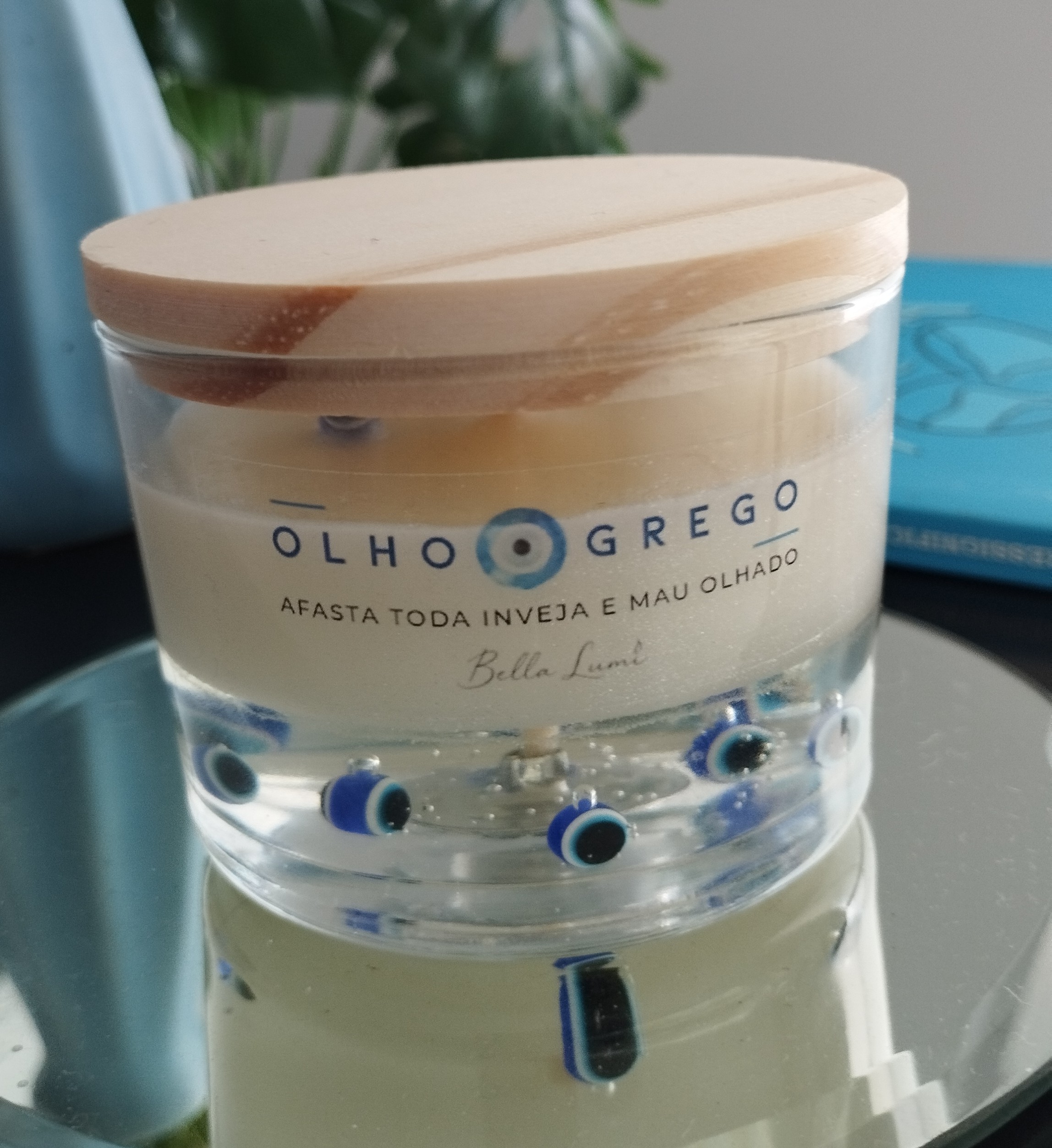 Olho Grego – Proteção e Luz | Coleção Fé\ Uma vela criada para proteger, equilibrar e envolver o ambiente com boas energias.\ Com fragrância fresca de capim limão, traz uma sensação imediata de limpeza, leveza e renovação, tornando o espaço mais harmonioso e energeticamente equilibrado.\ O símbolo do olho grego, conhecido por afastar energias negativas e o mau-olhado, transforma essa vela em um verdadeiro amuleto de proteção e intenção.\ Notas olfativas:\ Saída: capim limão, notas cítricas\ Corpo: ervas frescas\ Fundo: musk leve, nuances verdes\ Pensamos em cada detalhe: a vela é composta por base de cera vegetal e parafina em gel, revelando em seu interior miçangas de olho grego, que reforçam o significado de proteção e equilíbrio. O acabamento em vidro com identidade Bella Lumi traz sofisticação e leveza à peça.\ Além de aromática, é também decorativa, ideal para compor ambientes com significado e intenção. Cada unidade é cuidadosamente preparada, sendo uma opção especial para presentear ou energizar o seu espaço.\ Composição: Cera vegetal e parafina em gel\ Essência: Capim Limão\ Exalação: Suave/Média\ Benefícios: Auxilia na sensação de proteção, limpeza energética e renovação do ambiente\ Ideal para: entrada da casa, ambientes de trabalho, momentos de renovação e limpeza energética\ Peso: Aproximadamente 400 g\ Tempo de queima: 40 a 60 horas Produzido sob encomenda, prazo de até 7 dias corridos para a postagem após a confirmação do pagamento.